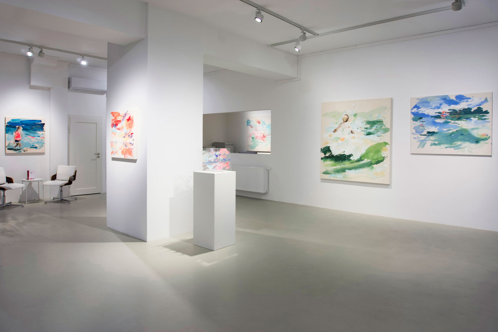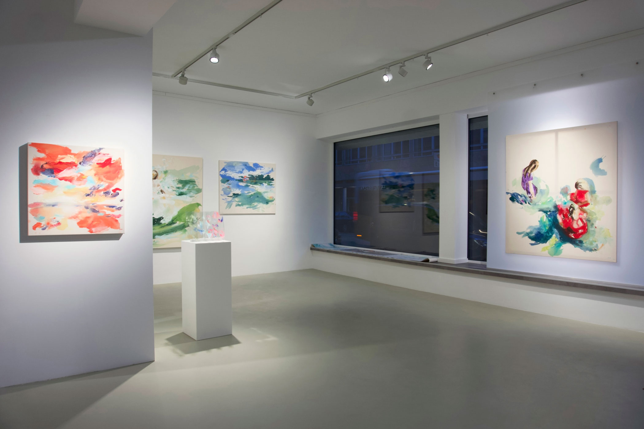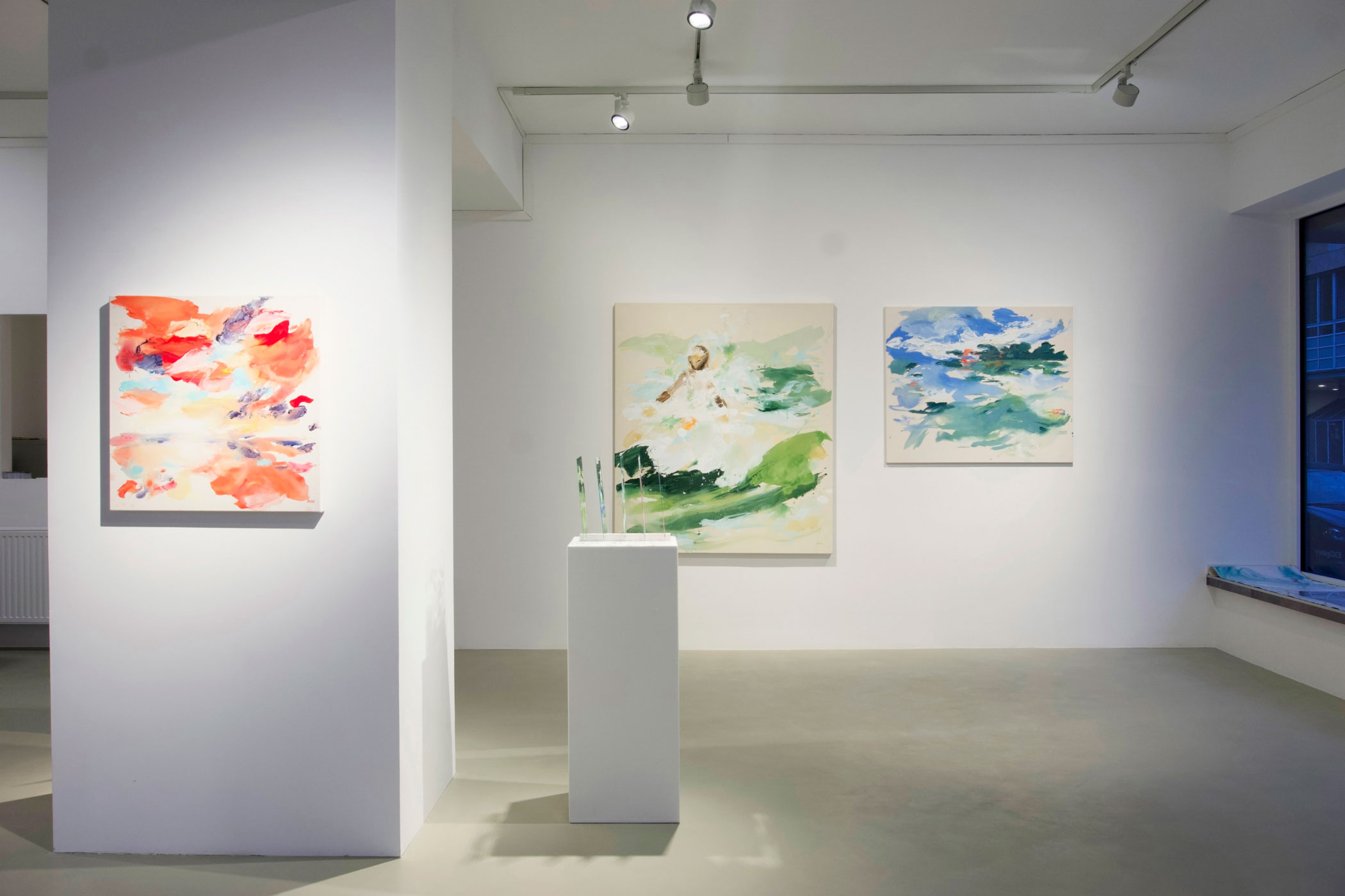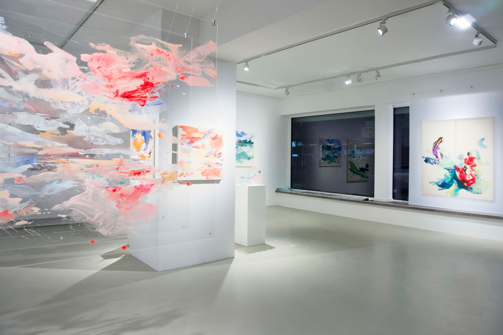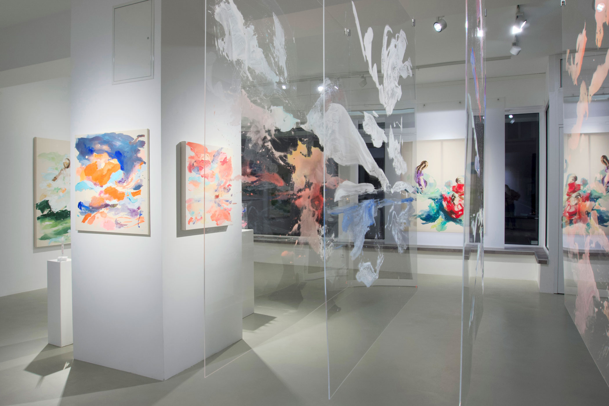 In der neuesten, erstmals präsentierten Serie geht die Künstlerin einen konsequenten Schritt weiter. Die klassische Leinwand wird durch transparentes Acrylglas ersetzt. Die Werke bestehen aus mehreren Schichten, die räumlich voneinander getrennt sind. Die Zwischenräume – Luft, Distanz, Durchlässigkeit – werden zu Hauptakteuren. Perspektive ist nicht mehr festgelegt, sondern abhängig vom Standort der Betrachtenden. Nähe und Entfernung, Freiheit und Verbindung verschieben sich mit jeder Bewegung.