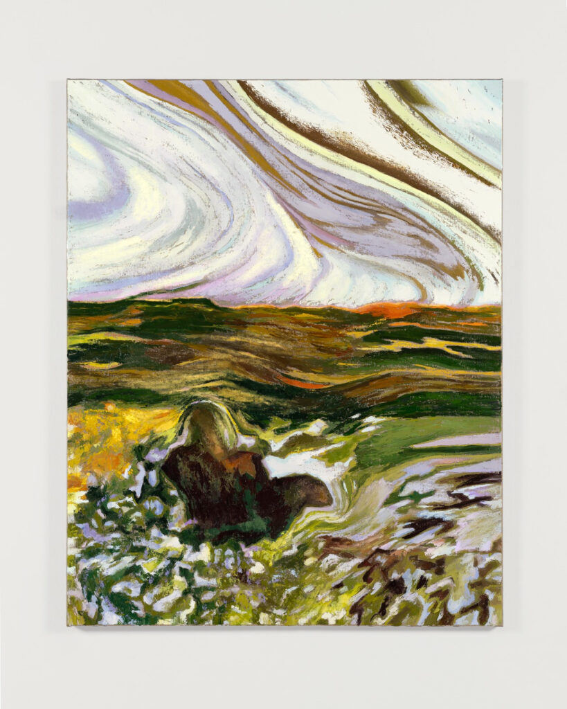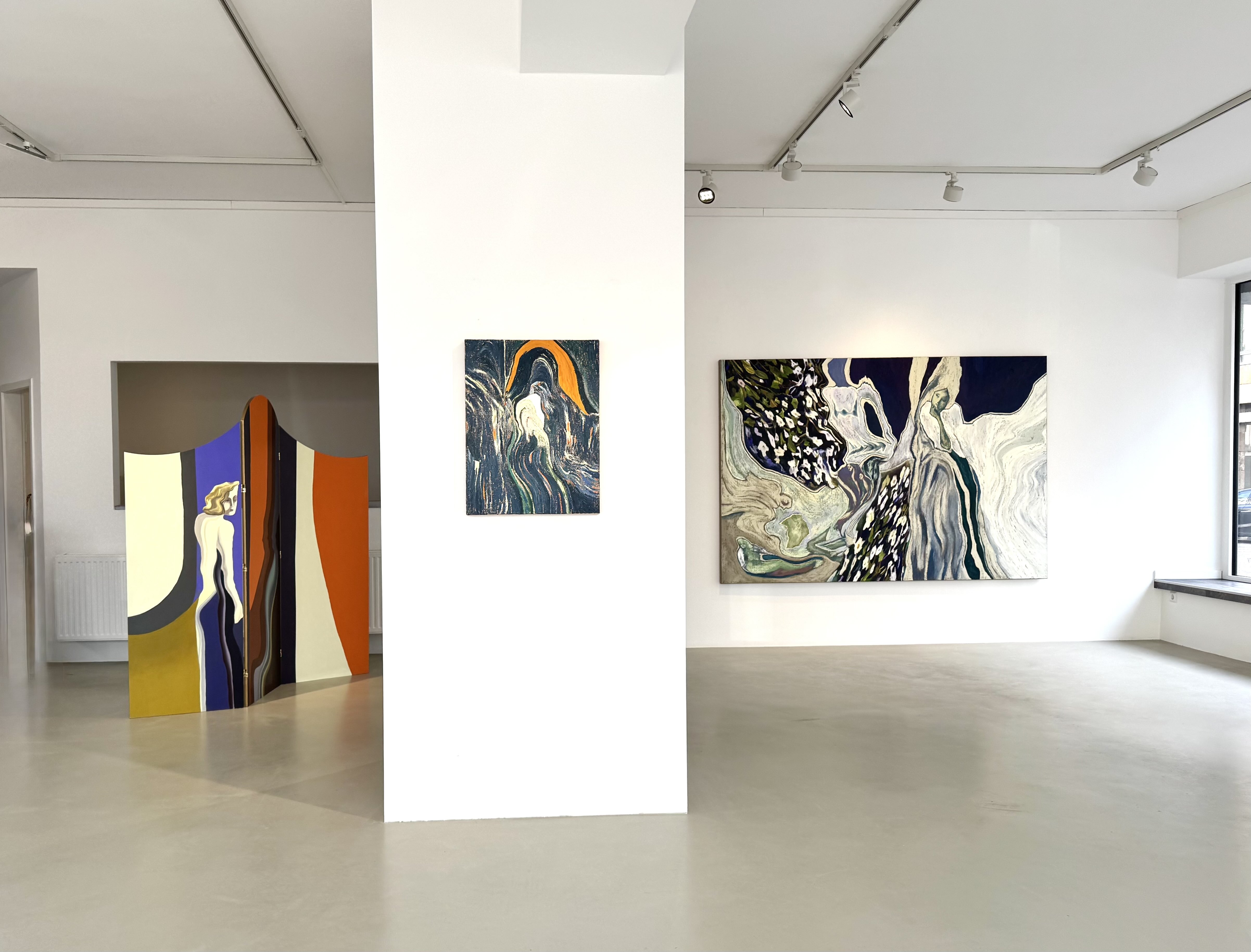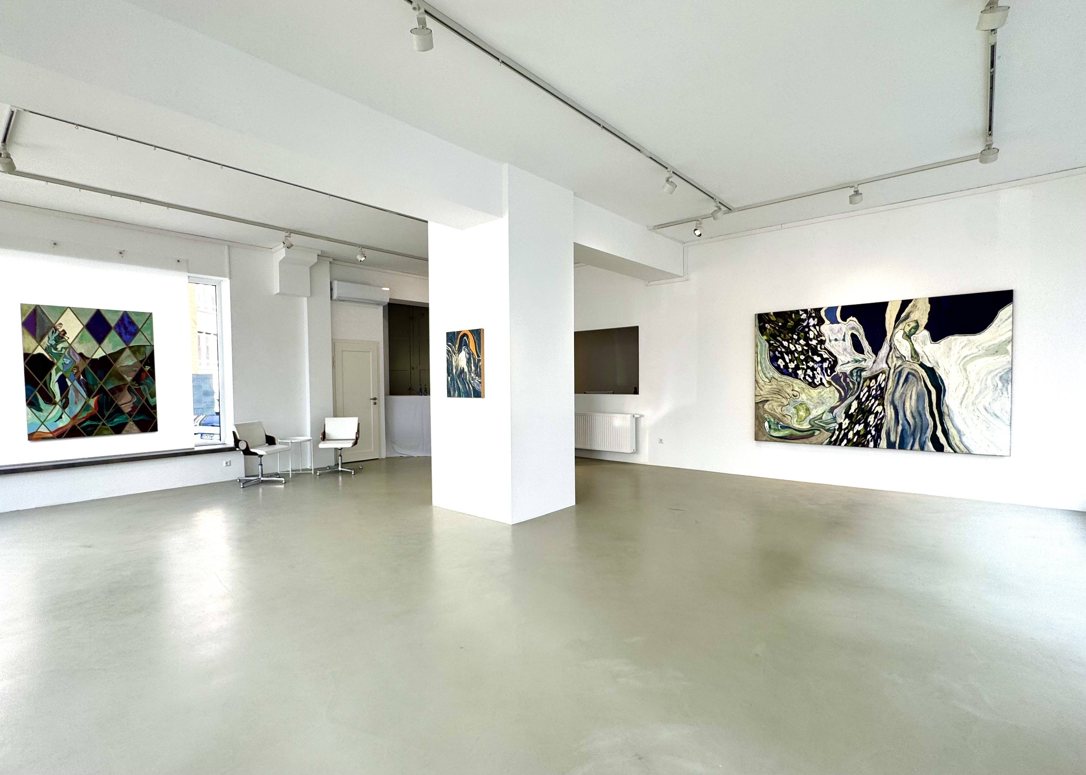 Her works, in which colors and shapes blur into one another in an almost psychedelic manner and hints of contours are stronger than detailed formulations, unfold a peculiar attractiveness coupled with ambivalence. They immediately draw the viewer into a pull, as if another, deeper level of reality were opening up behind the smooth surface of the image. Silhouettes of figures and situations appear familiar and at the same time distant, like set pieces illustrating fragments of memory that can never be fully grasped or held onto. (…)