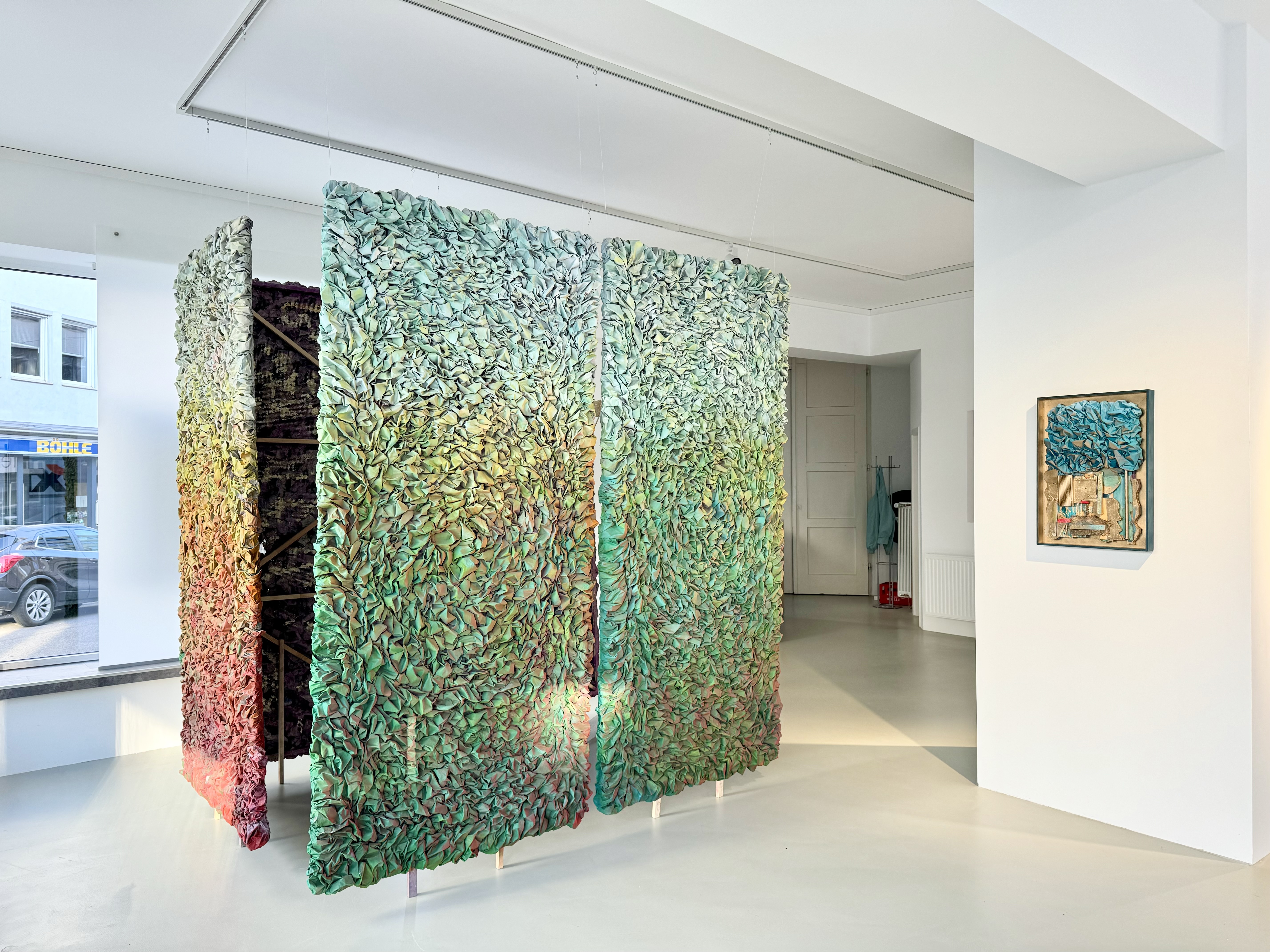 In contrast, Marina WitteMann’s works employ color to reflect emotional and physical states, using newspapers as a metaphor for media’s influence on our worldviews. By painting with captivating, nearly seductive hues, she creates objects of desire that are irresistible and alluring. Her artworks draw parallels to propaganda, offering easily understood myths that entice and ensnare. Marina’s interactive installation, composed of painted newspaper on a metal grid, underscores the transformative power of the written word. As viewers step inside, they are enveloped in complete silence, feeling the constraints of propaganda that subtly imprisons the mind.